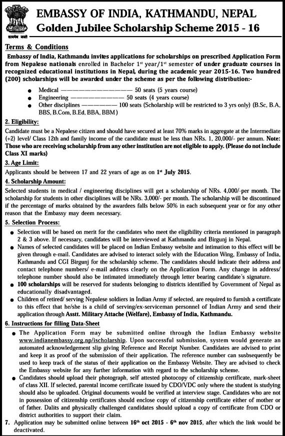 Vacancy in Nepal : Golden Jubilee Scholarship Scheme 2015-16 for Nepalese Students from Embassy of India Kathmandu